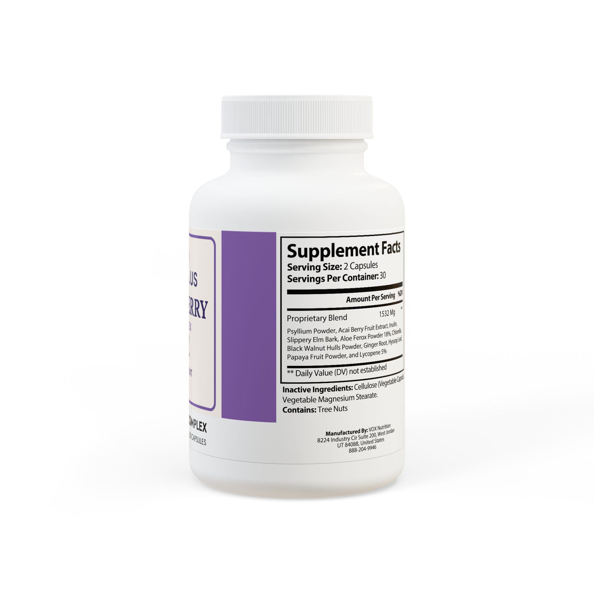 The Acai Berry Complex Supplement supports healthy bowel movements with a blend of key ingredients, including Psyllium Powder, Acai Berry Fruit Extract, Inulin, Slippery Elm Bark, Aloe Ferox Powder 18%, Chlorella, Black Walnut Hulls Powder, Ginger Root, Hyssop Leaf, Papaya Fruit Powder, and Lycopene 5% -- all masterfully balanced in a potent blend that you can easily incorporate in your regimen.